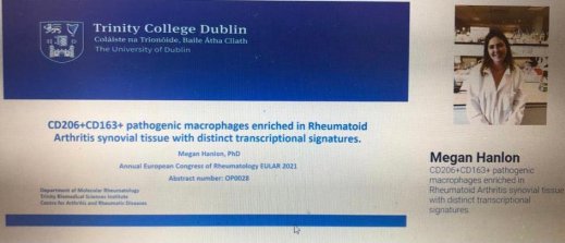This year’s EULAR meeting was held virtually and the Molecular Rheumatology research group were well represented. Well done to Dr Viviana Marzaioli, Dr Megan Hanlon, Dr Achilleas Floudas and Serena Foo who had oral presentations and poster sessions at the conference and were given the opportunity to field questions regarding their research.